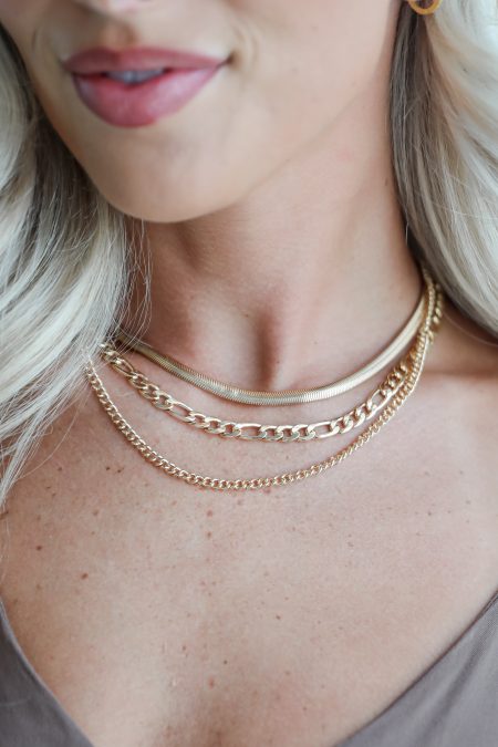 The Harper Gold Layered Snake Chain Necklace is brilliantly beautiful and always a good idea! This trendy necklace features three layers of gold chains including snake chains. Style the Harper Necklace with any outfit to instantly add a chic touch to your look! Gold Plated Layered Snake Chains Lobster Clasp…