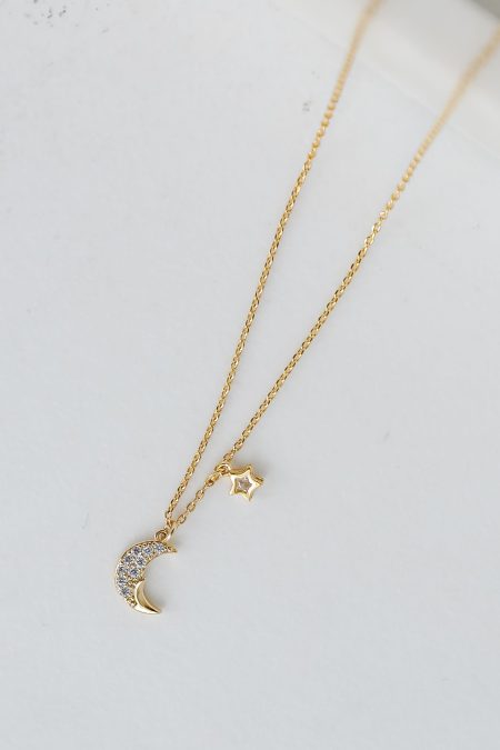 Dress up your look with your fave sandals and the summery vibes of the Emilee Gold Rhinestone Crescent Moon Charm Necklace! This cute necklace features a simple gold chain with a rhinestone crescent moon charm + star charm on the end. Style the Emilee Necklace with any outfit to instantly…